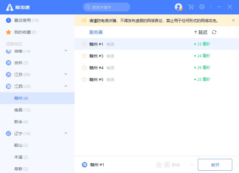 第三步:在首页筛选赣州的线路,然后一键连接即可。如果需要连接其他服务器,需要先断开当前连接的服务器再进入服务器列表重新选择连接。
