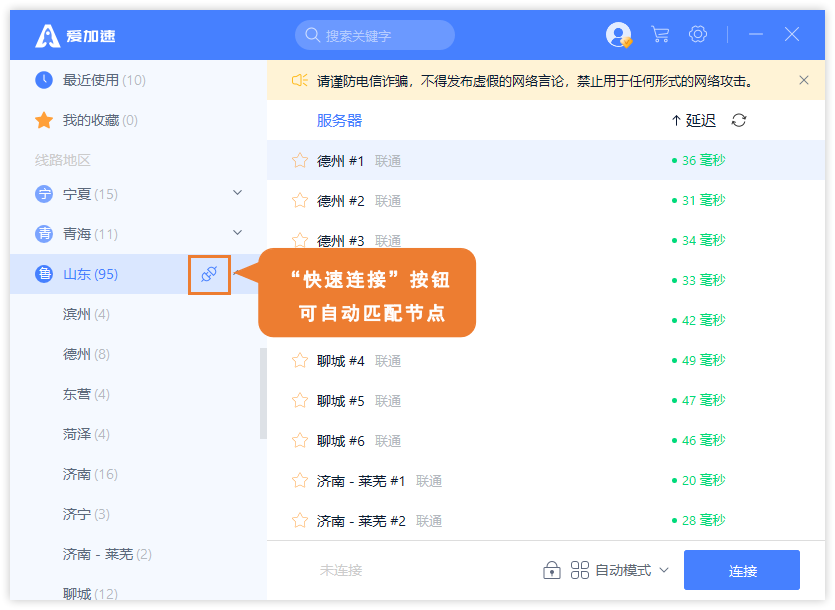 一般在使用爱加速切换网络时,都是通过省份 -> 城市 -> 线路的顺序依次进行挑选。当然,对于不想选择的用户,我们也设计了【快速连接】功能,让系统自动匹配节点,更为省时省力。