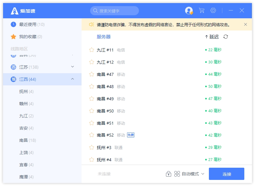 用户可以在爱加速代理上找到44台江西的服务器,它们位于南昌、赣州、九江、上饶等八座城市内,使用当地联通、移动或电信运营商的 IDC 机房。如此丰富又多样的江西 IP,相信可以很好地满足大多数用户的使用需求。