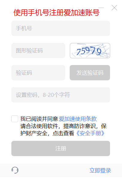 2、打开已安装完成的爱加速APP,使用手机号进行账号的注册与登录。