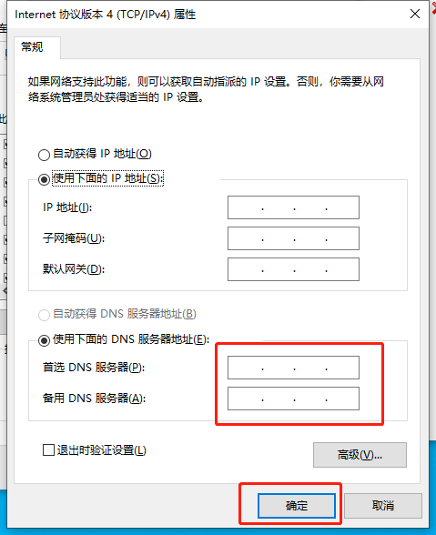 7、IP地址输入完成后,再接着输入配套的DNS服务器地址,全部输入完成后,点击“确定”按钮。