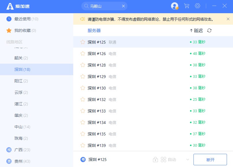 第三步:在首页筛选深圳的线路,然后一键连接即可。如果需要连接其他服务器,需要先断开当前连接的服务器再进入服务器列表重新选择连接。