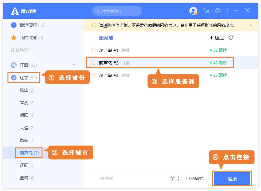 爱加速代理 IP 的界面简洁清爽,功能分区一目了然,操作起来也格外方便。先在31个省市自治区中寻找到辽宁省,然后进入城市列表找到葫芦岛,再打开下一级的线路列表,对比延迟等情况,挑选一个进行连接即可。