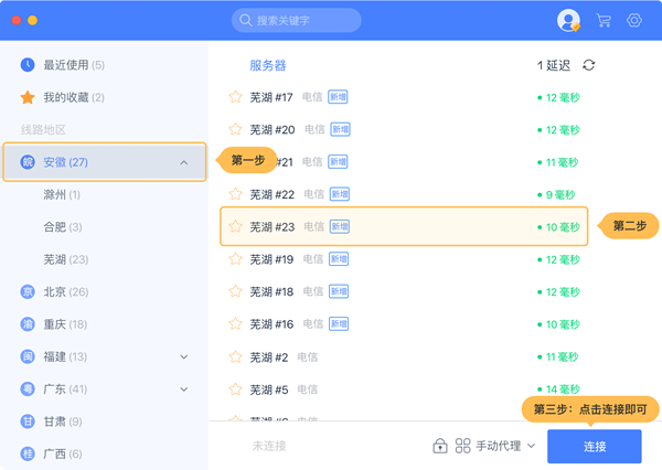 连接全程不需要繁琐配置,你只需根据自身需求选择一条线路(例如,访问电信服务时选择电信线路),然后连接即可。待连接成功后,你就可以开始网络活动了。
