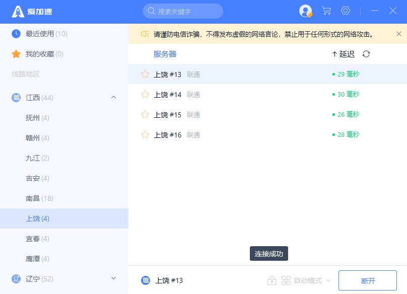 ③ 在爱加速左侧菜单中选择“线路地区”,找到“江西—上饶”选项,选择你想要连接的服务器节点,然后一键连接即可。