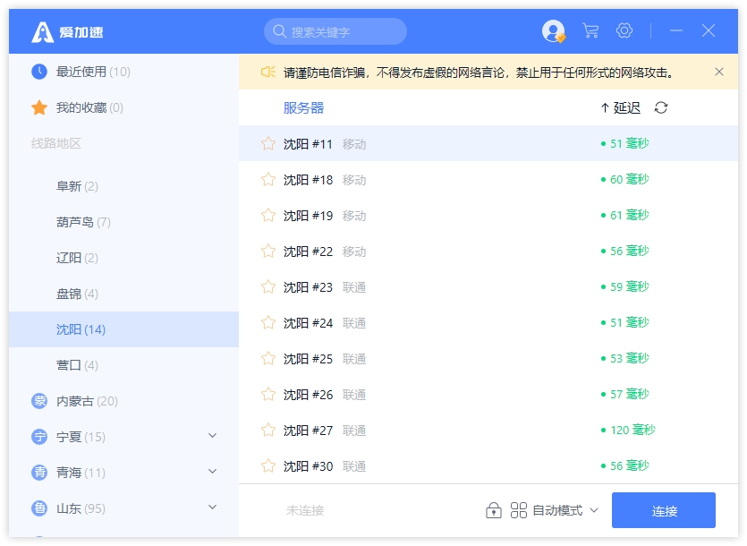 3. 连接服务器:登录后,你会看到爱加速的服务器列表,列出了在全国各地的服务器。想要获得沈阳 IP,你需要选择沈阳的服务器。选中沈阳的服务器后,点击“连接”即可。