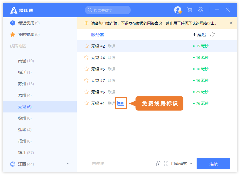特别的是,爱加速代理提供免费试用服务,无锡目前正好有1台免费服务器,天天都能免费连接使用20分钟。如果是新用户,那么可以多获取3天的免费时长。免费线路都会被标注上蓝色的“免费”二字,很容易区分出来。